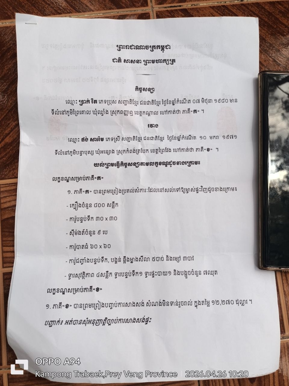 ស្ត្រីរងគ្រោះឈ្មោះ ផង់ សារ៉េម អាយុ ៥៦ឆ្នាំ បានចុះកិច្ចសន្យាម៉ៅសាងសង់ផ្ទះថ្មទំហំ ៦ម៉ែត្រ គុណ ៩ម៉ែត្រ ក្នុងតម្លៃ ១៣,០០០ដុល្លារ ប្រភេទ «ម៉ៅដាច់ កាន់សោចូលនៅ» នៅភូមិបន្ទាបុស្ស ឃុំអន្សោង ស្រុកកំពង់ត្របែក ខេត្តព្រៃវែង។ ប៉ុន្តែក្រោយបង់ប្រាក់អស់ដល់ ១២,២០០ដុល្លារ សំណង់ទើបសម្រេចបានប្រមាណ ៤០ភាគរយ ប៉ុណ្ណោះ។